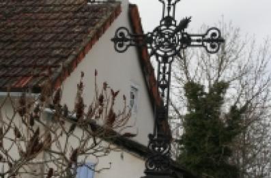 Cette croix en pierre emmurée, presque discoïdale, présente un personnage en prière, probablement la Vierge stylisée. Lire la suite