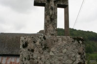 Croix de l'église en fer forgé avec Christ en son centre sur socle en pierre. Lire la suite